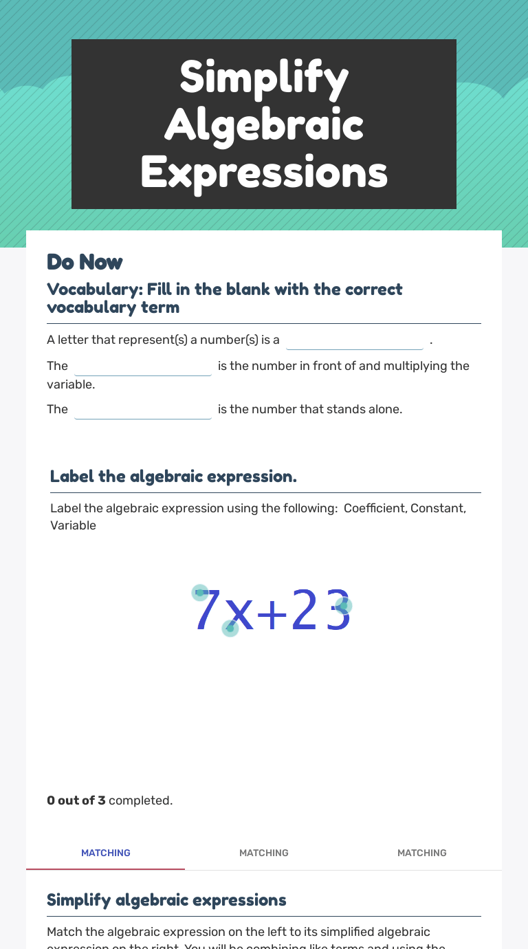 Simplify Algebraic Expressions Interactive Worksheet By Susan Cooper Wizer Me from dynamic.wizer.me Challenge students' comprehension of adding polynomials by working out the problems in these worksheets. Your students will use this collection of activity sheets to learn how to solve for variables to simplify algebraic expressions. Writing verbal expressions as mathematical expressions writing verbal expressions as algebraic equations simple distribution evaluating expressions evaluating expressions (2) single step problems two step problems two step equation maze direct variation constant of proportionality midpoint formula multiply binomials with area models multiplying. These equations worksheets are a good resource for students in the 5th grade through the 8th grade. These pdf worksheets for grade 6 are classified into easy … You may select the numbers. An expression involves two or more variables with or without a constant. With these printable worksheets, students will practice simplifying algebraic expressions.